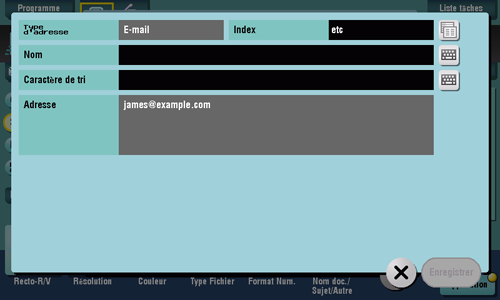 [Nom] | Entrez un nom de destination à afficher sur l'Écran tactile (24 caractères max.). Assignez un nom vous permettant d'identifier aisément la destination. |