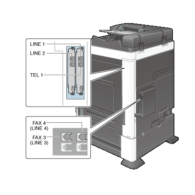 L'illustration représente une unité dotée du kit Fax FK-511, du kit Fax FK-508 et du kit de montage Fax MK-728 en option. FAX3 (port LINE 3) et FAX4 (port LINE 4) peuvent être utilisés sur des modèles destinés à l'Amérique du Nord parce que ces modèles sont compatibles avec le kit Fax FK-508 et le kit de montage Fax MK-728.