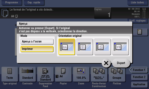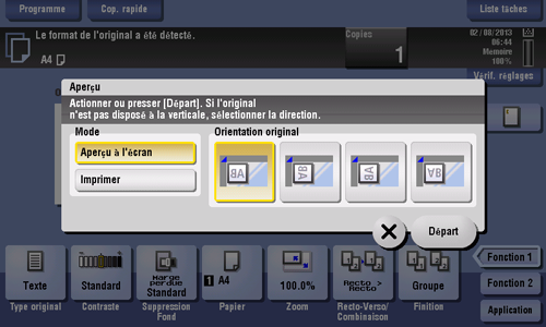 Tapez sur [Aperçu à l'écran] et sélectionnez la [Orientation original] en fonction de l'orientation de l'original.