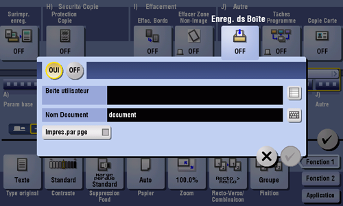 Sélectionnez [Application] - [Autre] pour régler [Enreg. ds Boîte] sur [OUI] et tapez sur la zone de saisie ou la liste des icônes de la [Boîte utilisateur].