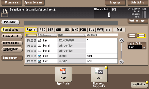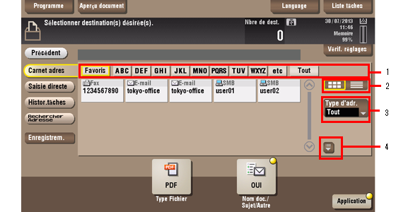 2 | Affiche les destinations enregistrées soit sous forme de boutons ou de liste. En cas de passage à l'affichage en liste, vous pouvez trier les destinations par numéros d'enregistrement, types de destination ou dans l'ordre alphabétique des noms de destination. |
