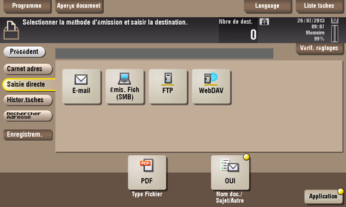 L'émission par diffusion est possible en sélectionnant plusieurs destinations. La diffusion peut également être utilisée pour d'autres fonctions de transfert de fichier telles que les e-mails simultanés et le transfert de fichier SMB.