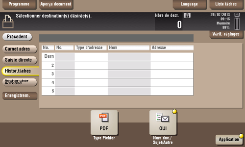 Tapez sur [Histor. tâches], puis sélectionnez une destination depuis l'historique des numérisations ou des tâches archivées.