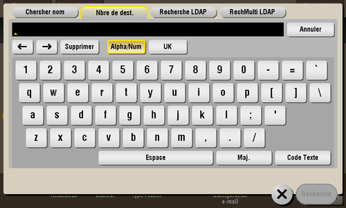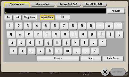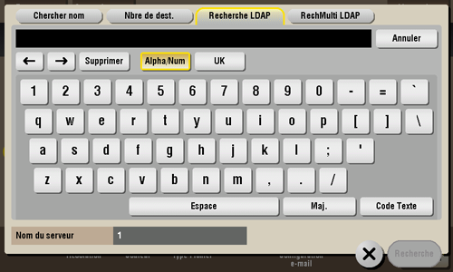 Il existe deux moyens d'effectuer une recherche : [Recherche LDAP] pour rechercher une adresse e-mail avec un seul mot-clé et [RechMulti LDAP] pour rechercher une adresse e-mail en combinant des mots-clés de différentes catégories.