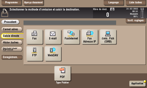 L'émission par diffusion est possible en sélectionnant plusieurs destinations. La diffusion peut également être utilisée pour d'autres fonctions de transfert de fichier telles que les e-mails simultanés et le transfert de fichier SMB.