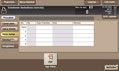 Tapez sur [Histor. tâches], puis sélectionnez une destination depuis l'historique des numérisations ou des tâches archivées.