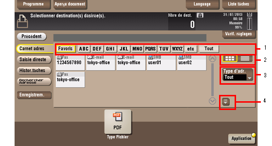 2 | Affiche les destinations enregistrées soit sous forme de boutons ou de liste. En cas de passage à l'affichage en liste, vous pouvez trier les destinations par numéros d'enregistrement, types de destination ou dans l'ordre alphabétique des noms de destination. |