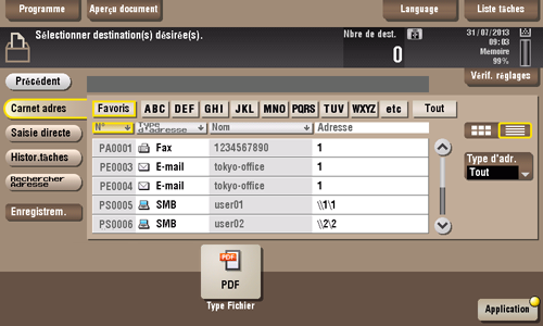 Si le nombre de destinations enregistré est important, vous pouvez rechercher une destination par nom d'enregistrement ou destination (adresse e-mail ou nom PC).