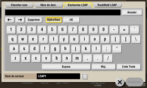 Il existe deux moyens d'effectuer une recherche : [Recherche LDAP] pour rechercher une adresse e-mail avec un seul mot-clé et [RechMulti LDAP] pour rechercher une adresse e-mail en combinant des mots-clés de différentes catégories.