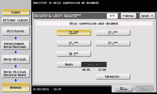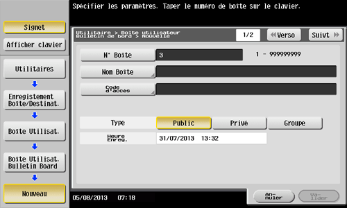 Tapez sur [Utilitaire] - [Enregistrement 1-Touche /Boîte] - [Boîte Utilisat.] - [Boîte Utilisat. Bulletin Board] - [Nouveau].