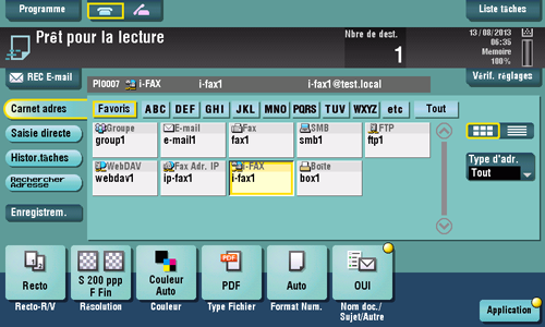 Au besoin, vous pouvez modifier l'affichage de l'écran principal du mode fax/numérisation (par défaut : [Carnet adres]). Pour des détails, voir ici.