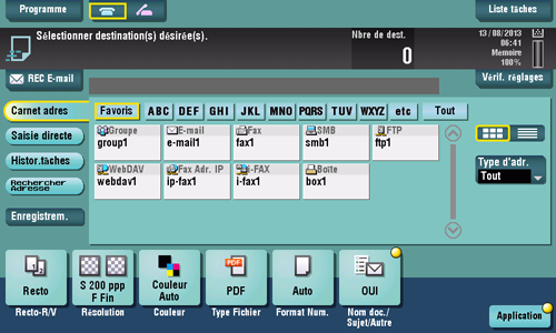 Il est possible d'enregistrer jusqu'à 2000 adresses. Les types de destination susceptibles d'être enregistrés sont l'adresse e-mail, le nom de l'ordinateur, etc. en fonction du mode d'émission.