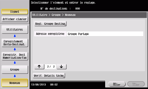 Tapez sur [Utilitaire] - [Enregistrement 1-Touche /Boîte] - [Enregistr. Dest Numérisation/Fax] - [Groupe] - [Nouveau].