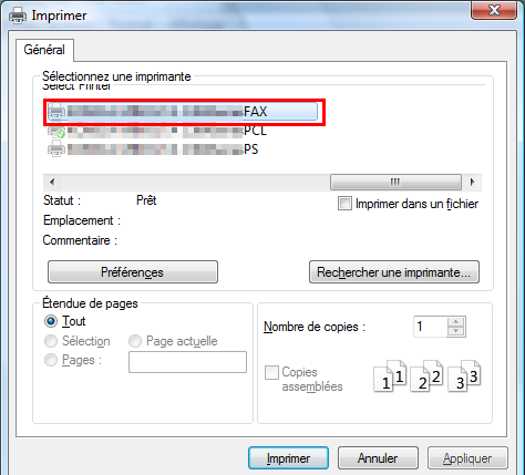 2. Vérifiez que le pilote de fax de cette machine est sélectionné dans [Nom de l'imprimante] (ou [Sélectionnez une imprimante]).