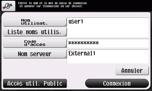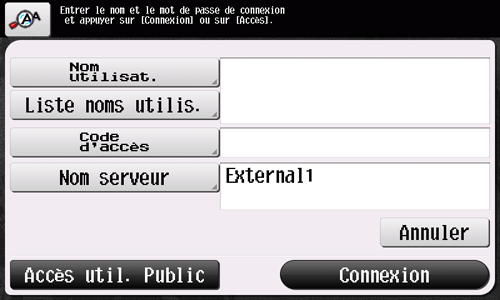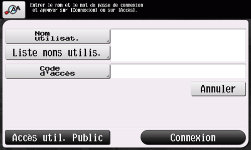 Si Boîte utilis. Public (utilisateurs non enregistrés) est activé, tapez [Accès util. Public] pour vous connecter sur cette machine.