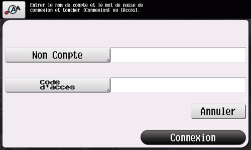 Si Authentification ou Compte Département est installé sur cette machine, l'écran Connexion apparaît sur l'Écran tactile.