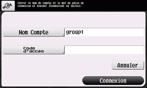 Entrez le nom de l'utilisateur ou du compte département et le mot de passe sur l'écran de connexion, puis tapez sur [Connexion] ou tapez sur [Code] pour procéder à l'authentification. Une fois que l'opération prévue est terminée, tapez sur [Code] pour vous déconnecter.