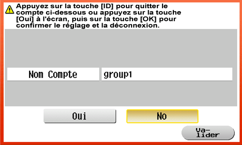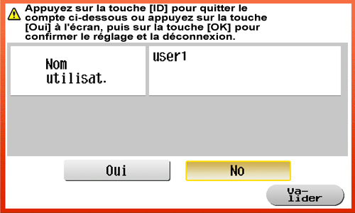 Pour configurer les paramètres, sélectionnez [Utilitaire] - [Réglage Administrateur] - [Identification utilisateur/Compte Département] - [Param.Commun Util./Compte] - [Réglage Affichage Écran Confirmation de Déconnexion].
