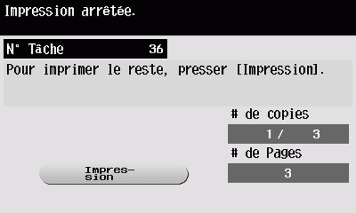 Si vous appuyez sur la touche Arrêt pendant la numérisation d'un original, le traitement est interrompu et une liste des tâches suspendues s'affiche. Pour annuler l'opération, supprimez les tâches stoppées de la liste.