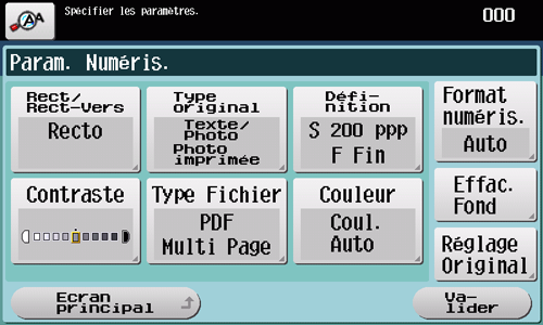 Le programme numérisation/fax contient une combinaison de réglages communément utilisés comme une clé de rappel. Pour la transmission, rappelez le programme numérisation/fax programme d'une simple pression de bouton à l'écran principal de Zoom Écran.