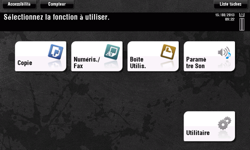 [Accessibilité] est disponible lors de la configuration de l'environnement d'exploitation du Panneau de contrôle, p. ex. pour ajuster une position pour effleurer l'Écran tactile ou pour changer les sons des touches.