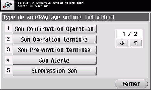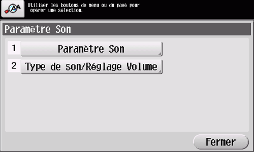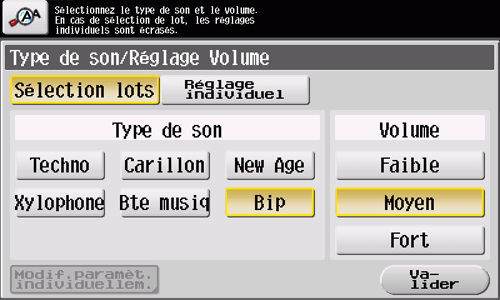 [Type de son/Réglage Volume] | Spécifiez le type et le volume du son pour chaque [Son Confirmation Opération], [Son Opération terminée], [Son Préparation terminée], [Son Alerte], [Suppression Son] et [Son d'authentification]. Si [Sélection lots] est sélectionné, tous les sons et les volumes de son seront réglés en une fois. Sélectionnez le type de son parmi six types et sélectionnez le volume sonore entre [Fort] [Moyen] [Faible] pour le réglage. Si [Réglage individuel] est sélectionné, tous les types de son et de volumes seront réglés séparément. |