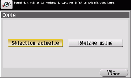 Modifiez les réglages par défaut (réglages quand l'alimentation est activée ou que Initialiser est actionné) en mode Zoom écran. Vous pouvez modifier le réglage par défaut en sélectionnant [Sélection actuelle] après que le réglage de chaque fonction est changé (par défaut : [Réglage usine].
