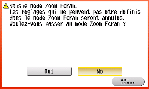 Si cette machine n'est pas utilisée en mode Zoom Écran pendant un certain temps, le mode Zoom Écran est automatiquement annulé. Si nécessaire, affichez l'écran suivant pour vérifier s'il faut annuler le mode Zoom Écran.