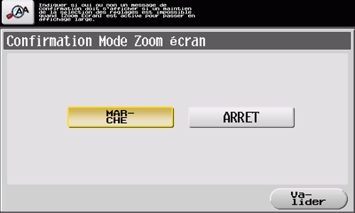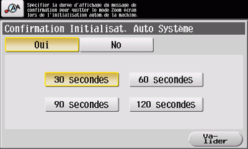 Tapez sur [Accessibilité] - [Confirmation Initialisat. Auto Système] et sélectionnez s'il faut vérifier une annulation du mode Zoom Écran en affichant l'écran (par défaut : [No]). Lors de l'affichage de l'écran sélectionnez la durée d'affichage de l'écran.
