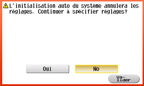 Si cette machine n'est pas utilisée pendant un certain temps, les réglages sont automatiquement réinitialisés. Si nécessaire, affichez l'écran suivant pour vérifier s'il faut réinitialiser les réglages.