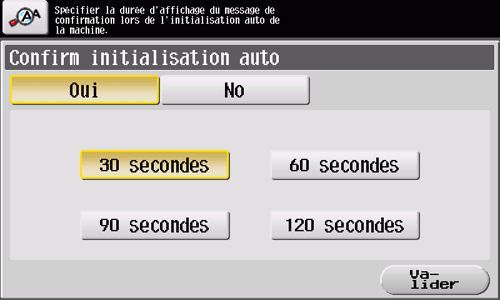 Effleurez [Accessibilité] - [Confirm initialisation auto] et indiquez si vous souhaitez afficher l'écran de confirmation qui active ou désactive la remise à zéro des réglages. (Par défaut : [No]). Lors de l'affichage de l'écran sélectionnez la durée d'affichage de l'écran.