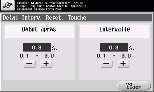 [Intervalle] | Changez l'intervalle de maintien d'une touche enfoncée et d'entrée de caractères successifs. [0,3] s est spécifié par défaut. |