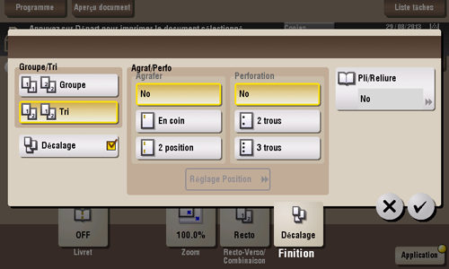 Si l'unité de finition ou le séparateur de travaux JS-506 n'est pas installé, les feuilles imprimées sont éjectées et triées par copies ou page selon un schéma croisé en alternance lorsque les conditions suivantes sont satisfaites.