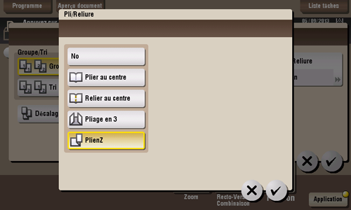 Pour utiliser la fonction Pliage en Z, l'Unité de finition FS-535 et l'Unité de pliage en Z ZU-606 sont requises (uniquement pour le bizhub 554e).