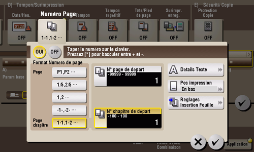 [N° chapitre de départ] | Entrez le numéro du chapitre de départ si un original est divisé en chapitres et que vous voulez imprimer des numéros de chapitre à partir du second chapitre à l'aide du clavier. Pour afficher le clavier, tapez sur la zone de saisie des chiffres. Vous ne pouvez spécifier des numéros de chapitre que si vous avez sélectionné [Page chapitre] dans [Format Numéro de page]. Par exemple, pour imprimer des numéros de chapitre à partir du troisième chapitre, entrez "-1". Le premier chapitre du fichier est compté comme "-1" et le deuxième chapitre comme "0", le troisième chapitre est compté comme "1". Dans [N° chapitre de départ], le numéro de chapitre est imprimé sur les chapitres comptés à partir de 1 et les suivants. Si "2" est entré, le numéro est imprimé à compter de la première page du premier chapitre du fichier comme "2-1, 2-2". "-" (signe moins) changements à + à chaque fois que vous tapez sur [*]. |