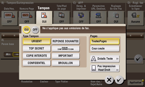 Le texte tel que "RÉPONSE SOUHAITÉE" et "COPIE INTERDITE" est imprimé sur la première page ou sur toutes les pages. Vous pouvez sélectionner le texte à imprimer parmi les tampons fixes enregistrés et les tampons enregistrés de manière arbitraire.