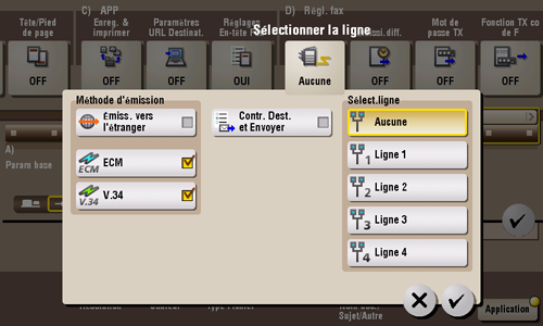 [Sélect.ligne] | Si plusieurs lignes sont disponibles, sélectionnez la ligne utilisée pour la télécopie. En général, utilisez [Ligne 1]. Si [Aucune] n'est sélectionnée, des deux lignes, c'est la ligne non occupée qui sera utilisée pour l'émission. |