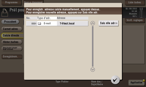 Si nécessaire, vous pouvez enregistrer la destination que vous directement saisie dans le carnet d'adresses. Pour des détails sur le mode d'enregistrement, voir ici.