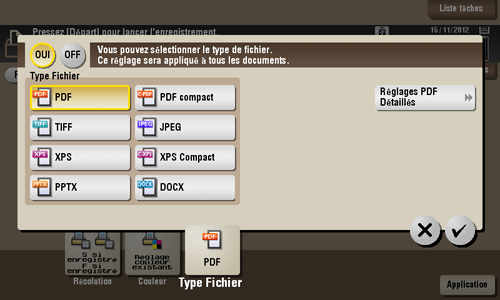 [Réglages PDF détaillés] | Si [PDF] ou [PDF compact] est sélectionné comme format de fichier, vous pouvez configurer les réglages de l'option PDF. Vous pouvez améliorer la sécurité en joignant une signature numérique identifiant l'auteur du fichier, en cryptant le fichier, etc. Pour des détails, voir ici. |
