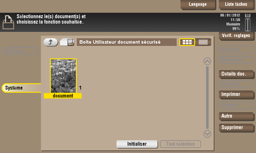 Lorsque vous imprimez un document depuis le PC ou lorsque vous sélectionnez la fonction Impression sécurisée via le pilote d'imprimante, ce fichier de données est archivé dans la boîte Document sécurisé. Une fois que vous avez ouvert la boîte utilisateur, vous pouvez sélectionner un fichier archivé dans la boîte utilisateur et afficher un aperçu, l'imprimer, le renommer ou le supprimer.
