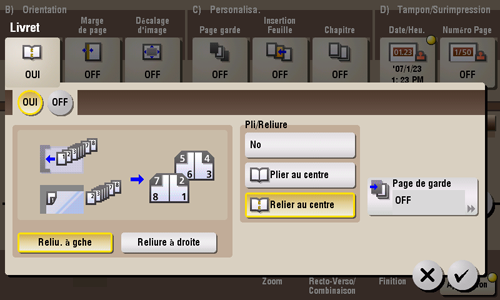 [Pli/Reliure] | Permet d'agrafer les feuilles imprimées au centre ou de les plier au milieu avant de les éjecter.