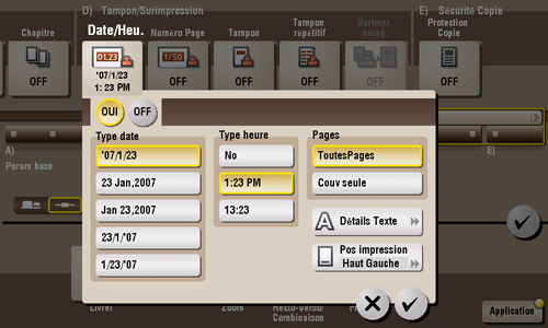 Vous pouvez sélectionner une position d'impression et un format et ajouter la date et l'heure. La date et l'heure peuvent être imprimées soit sur toutes les pages, soit uniquement sur la première page.