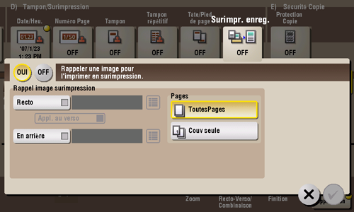 [Rappel image surimpression] | Spécifiez la face du papier pour composer l'image de surimpression et sélectionnez une image de surimpression à composer. Si nécessaire, vérifiez la densité, la méthode de composition et l'aperçu de l'image de surimpression. Si vous activez [Appl. au verso], l'image au recto est composée au version du papier. |