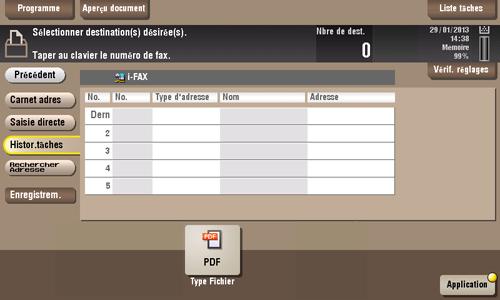 Tapez sur [Histor.tâches], puis sélectionnez une destination depuis l'historique des numérisations ou des fax. Pour les besoins de l'historique, les dernières tâches (cinq max.) sont affichées. Si nécessaire, vous pouvez sélectionner plusieurs destinations dans l'historique.