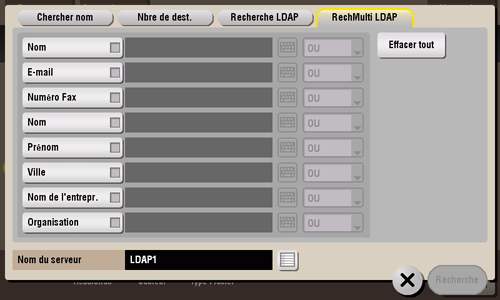 En cas d'utilisation du serveur LDAP ou de Active Directory de Windows Server, spécifiez une combinaison de mots-clés de différentes catégories à rechercher pour une adresse e-mail ou un numéro de fax.