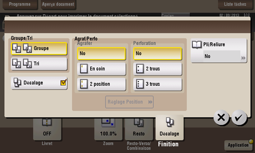 Si l'unité de finition ou le séparateur de travaux JS-506 n'est pas installé, les feuilles imprimées sont éjectées et triées par copies ou page selon un schéma croisé en alternance lorsque les conditions suivantes sont satisfaites.