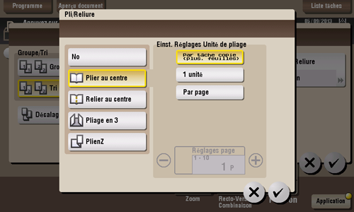 Éjecte une feuille imprimée en la pliant en deux. De même, sélectionnez l'unité selon laquelle le papier est plié parmi [Par tâche copie (plus. feuilles)], [1 unité] et [Par page]. Quand vous choisissez [Par page], spécifiez le nombre de pages à plier à la fois.