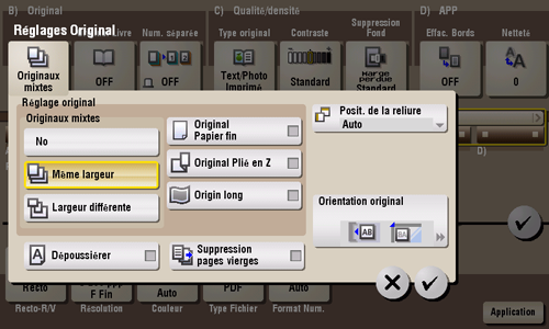 Même pour un original avec des pages de formats différents, le Chargeur ADF vous permet de numériser les données tout en détectant le format de chaque page. Si les largeurs des originaux sont identiques, sélectionnez [Même largeur]. Si les largeurs des originaux ne sont pas identiques, sélectionnez [Largeur différente].