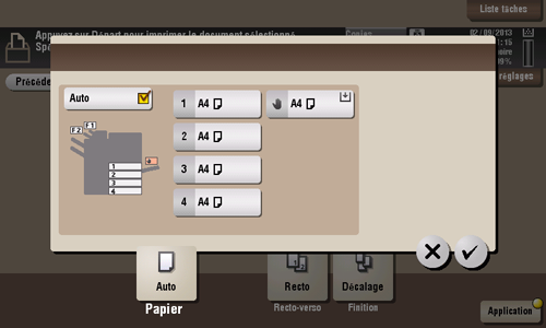 [Auto] | Tapez sur ce bouton pour sélectionner automatiquement le papier dont le format est le mieux adapté à l'original avant son impression. |