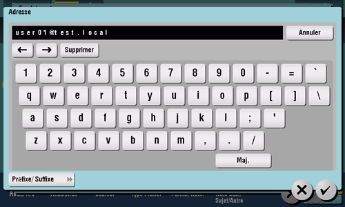 Si les préfixes et les suffixes de l'adresse e-mail sont enregistrés, vous pouvez rappeler un nom de domaine enregistré, etc. pour compléter la saisie.